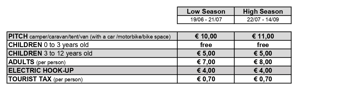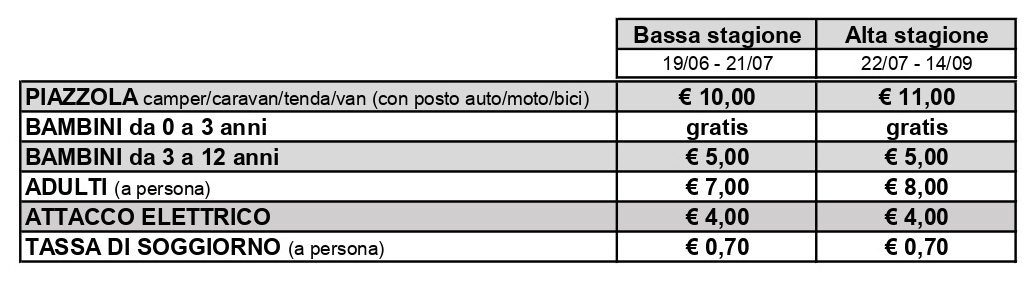 *Le tariffe si intendono comprensive dell'utilizzo delle docce.