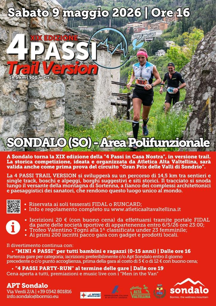 A Sondalo torna la XIX edizione della "4 Passi in Casa Nostra", in versione trail. La storica competizione, ideata e organizzata da Atletica Alta Valtellina, sarà valida anche come prima prova del circuito “Gran Prix delle Valli di Sondrio”.