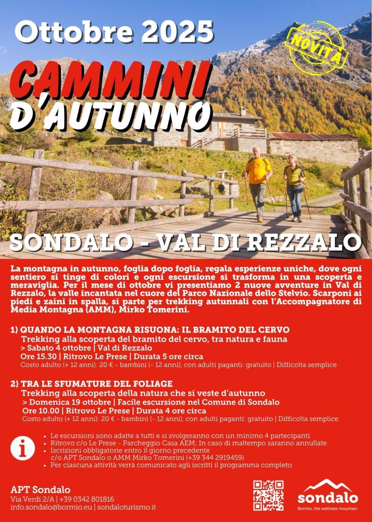 L’autunno in montagna è un incanto: i boschi si colorano, i sentieri si trasformano e ogni passo regala emozioni nuove. In Val di Rezzalo, nel cuore del Parco Nazionale dello Stelvio, ottobre diventa il mese perfetto per vivere la natura con due cammini speciali, accompagnati da Mirko Tomerini, Accompagnatore di Media Montagna.
