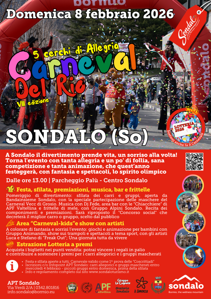 Il divertimento prende vita, un sorriso alla volta! Domenica 8 febbraio 2026 Sondalo è pronta a esplodere di colori, musica e fantasia con l’VIII edizione del Carneval del Rio, l’evento che unisce tradizione, spettacolo e tanta sana follia.