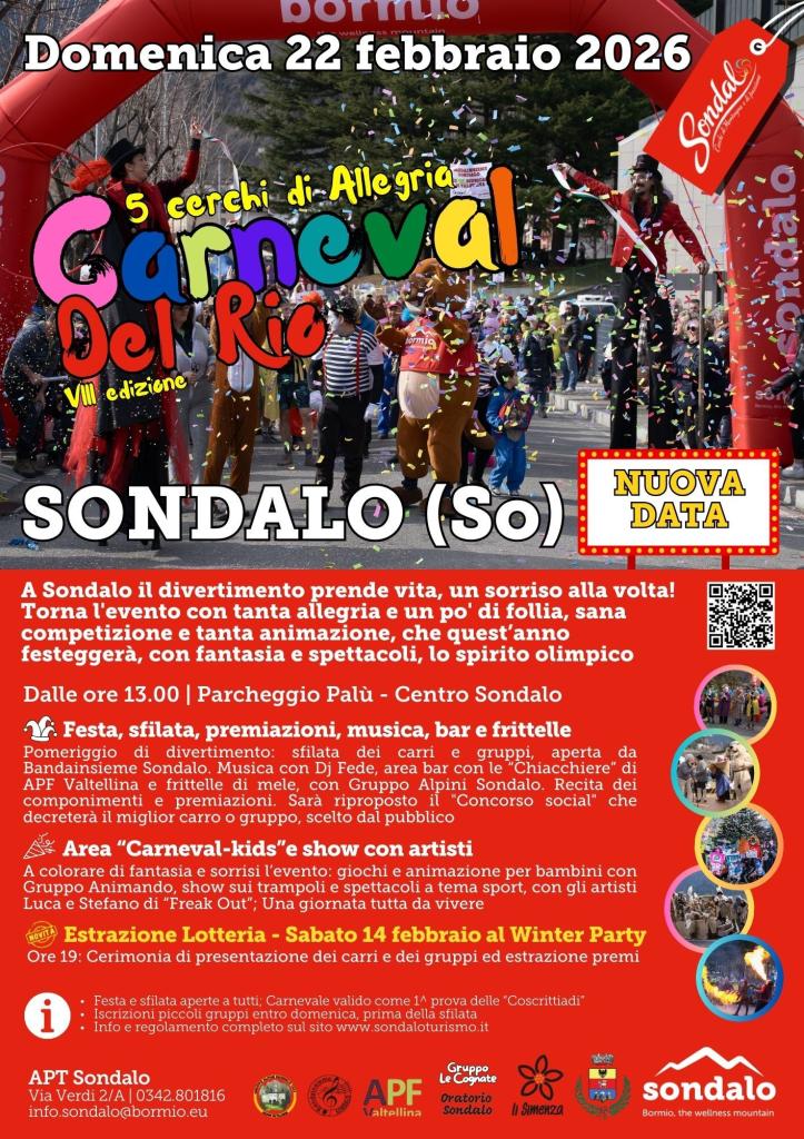 Il divertimento prende vita, un sorriso alla volta! Domenica 22 febbraio 2026 Sondalo è pronta a esplodere di colori, musica e fantasia con l’VIII edizione del Carneval del Rio, l’evento che unisce tradizione, spettacolo e tanta sana follia.