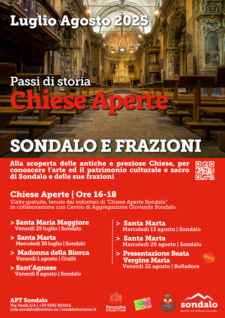 Confermate le attese visite guidate gratuite alle Chiese storiche di Sondalo e delle sue frazioni, un’occasione per scoprire luoghi di straordinario valore artistico e spirituale grazie all’impegno dei volontari del gruppo “Chiese Aperte Sondalo”, in collaborazione con il Centro di Aggregazione Giovanile di Sondalo e le Parrocchie di Sondalo e Frontale.