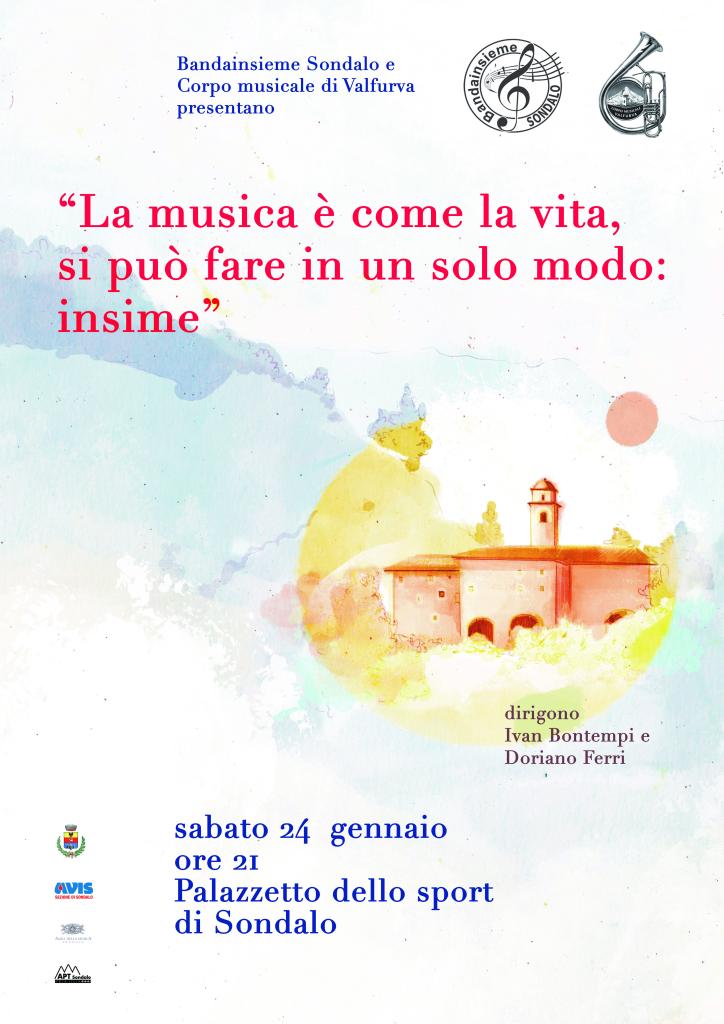 In occasione di Santa Agnese, patrona di Sondalo Bandainsieme Sondalo, diretta dai maestri Ivan Bontempi e Doriano Ferri, organizza, per sabato 24 gennaio alle h. 21 un concerto dal titolo: "La musica è come la vita, si può fare in un solo modo: insieme"