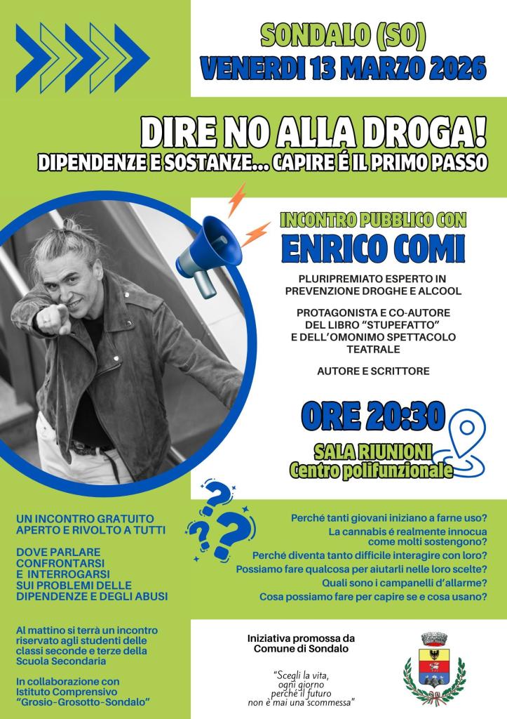 Venerdì 13 marzo 2026, alle ore 20:30, presso la Sala riunioni del Centro Polifunzionale di Sondalo, si terrà un importante incontro pubblico dedicato al tema delle dipendenze e dell’abuso di sostanze.