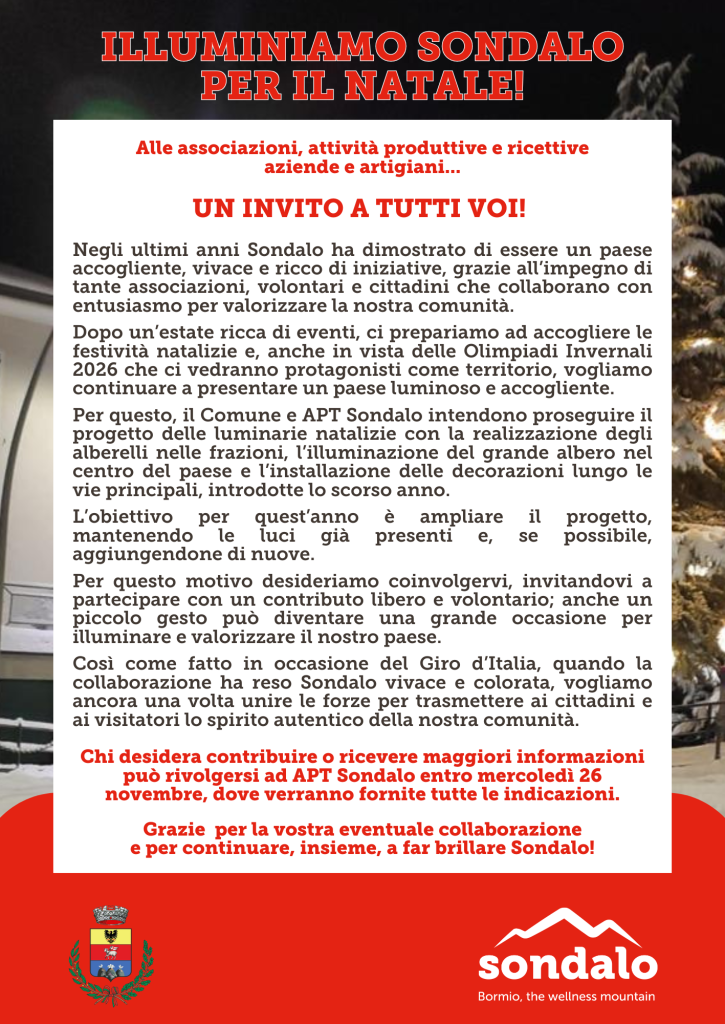 in vista delle prossime festività natalizie e con lo sguardo rivolto alle Olimpiadi Invernali 2026, il Comune e l’APT Sondalo desiderano continuare a rendere il nostro paese sempre più accogliente e luminoso.