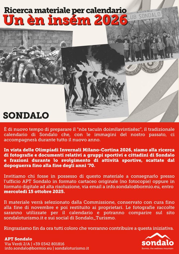 Invitiamo chi fosse in possesso di questo materiale a consegnarlo presso l’ufficio APT Sondalo in formato cartaceo originale (no fotocopie) oppure in formato digitale ad alta risoluzione, via email a info.sondalo@bormio.eu, entro mercoledì 15 ottobre 2025.