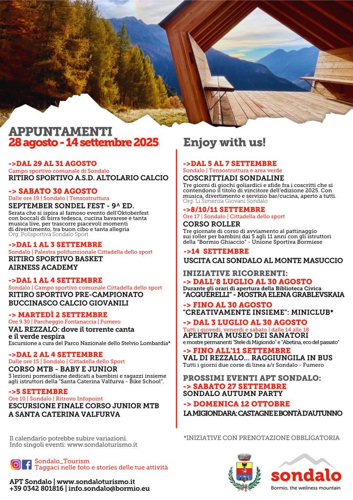 Scopri tutti i prossimi appuntamenti in programma a Sondalo: un ricco calendario di eventi, attività e iniziative pensate per coinvolgere grandi e piccoli, all’insegna della cultura, dello sport e del divertimento.
