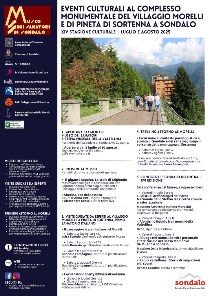 Il ricco calendario di iniziative prevede alcuni importanti eventi, le tradizionali visite guidate da esperti al Villaggio Morelli e a Pineta di Sortenna, primo sanatorio liberty italiano, le conferenze del ciclo "Sondalo Incontra - XVII edizione".